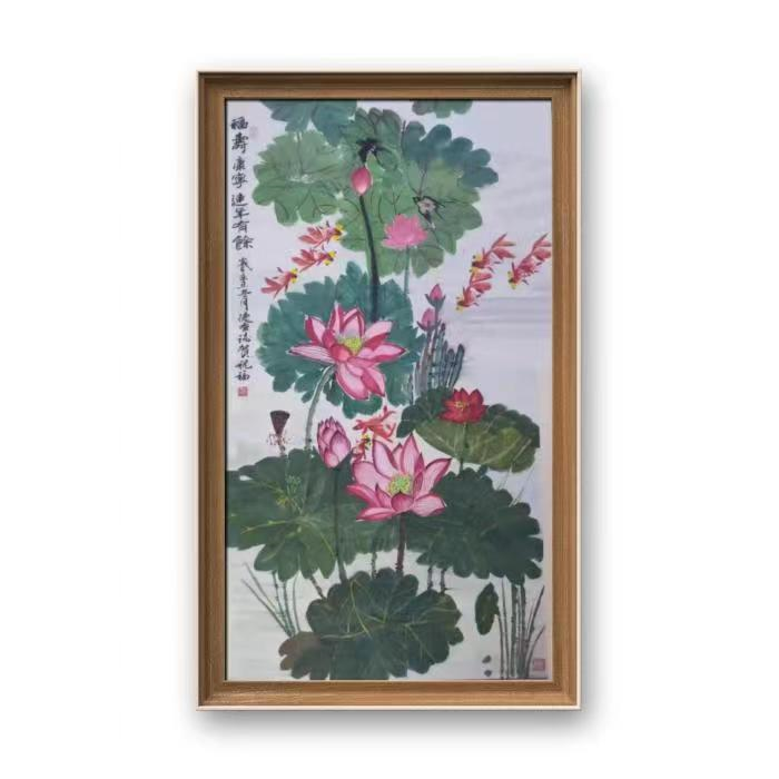 荷花因其清雅高洁的气韵为人们所喜爱,人们常常会在家里挂一幅荷花图,素雅清单,美丽脱俗,感受夏日的清爽气息。荷”与“和”谐音,在我国传统文化中,经常以荷花作为和谐的象征。和谐寓康宁,和谐万事兴。金鱼本身颜色靓丽,在国画中寓意“有余”,大家在欣赏优雅的作品同时,也愿生活连年有余。