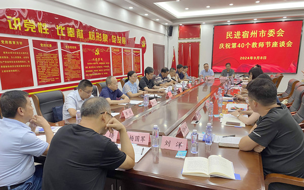 9月8日下午,民进宿州市委会召开庆祝第40个教师节座谈会。民进安徽省委会副主委、宿州市委会主委杨泽胜,市委会副主委赵辉、葛萌萌、唐向阳,秘书长朱金宝出席会议。市委会委员、教育总支主委汪材印,市委会委员、区直总支主委梁好,教育一支部、教育二支部、教育三支部、职教支部、学院支部、2023新会员支部主委,10名教师会员代表参加会议。会议由葛萌萌主持。