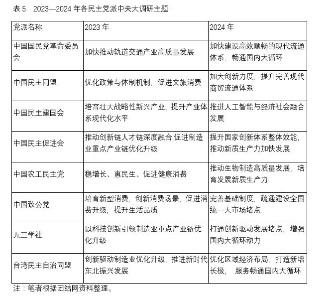 中共中央《关于加强政党协商的实施意见》指出:“中共中央每年委托民主党派中央就经济社会发展重大问题开展重点考察、调研,由中共中央统战部实施。中共中央统战部每年召开选题介绍会,协助民主党派中央确定调研题目,协调有关部门参与调研,做好组织保障工作。支持民主党派中央结合自身特色开展经常性考察调研。”每年的民主党派中央大调研,是参政议政工作的“重头戏”。在2024年,中共中央委托各民主党派中央大调研的主题围绕国内大循环、新质生产力展开;2023年则主要围绕促进消费、推动制造业、产业链优化升级展开(见表5)。2024年全国“两会”期间,各民主党派、无党派人士根据2023年调研情况,将调研成果转化为563件政协提案。如致公党35件提案中,有18件来自致公党中央2023年的调研课题转化,17件来自各地方组织报送的调研成果转化。民主党派和无党派人士的调查研究在切实履行参政议政职能的同时,也有力保障和推进国家社会良好有序发展,为全面建成社会主义现代化强国提供助力。