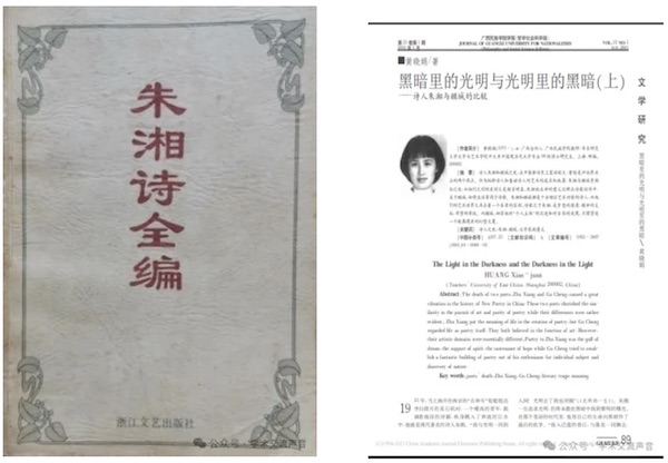 黄:我的第一个研究成果确可说是女性文学研究,但中间也有插曲。本科毕业后分配到广西民族学院工作,我马上意识到已有的学术积累不足以胜任本科教学科研,因此很快回炉广西师范大学攻读硕士研究生课程。在研究生阶段,那时也是中国当代新诗潮尚未消歇之时,我又喜欢诗歌,就写作了硕士论文《朱湘与顾城比较研究》,并在2001年以《黑暗里的光明与光明里的黑暗(上、下)——诗人朱湘与顾城的比较》为题,在《广西民族学院学报》第1期、第2期上进行了连载。朱湘和顾城虽处于不同的时代,但都是才子型诗人。朱湘的诗以古典美为特色,但他深受西方诗歌影响,他的新诗是想复合出一个不脱离民族本位又具有现代意识的文化中国。朱湘被鲁迅称为“中国的济慈”,他翻译的英国诗歌也很美,如济慈的《夜莺颂》,到现在我都还记得。顾城一出手就是先锋的,他的诗歌一看就是现代派,但他的语言,尤其是意象,简约跳跃又归于整体,不离中国诗歌的特性。但在1993年发生了顾城在新西兰激流岛杀妻事件后,又引发我对于女性生存和命运的思考。我想,我今后的主攻方向,仍然确定在女性文学研究之上。