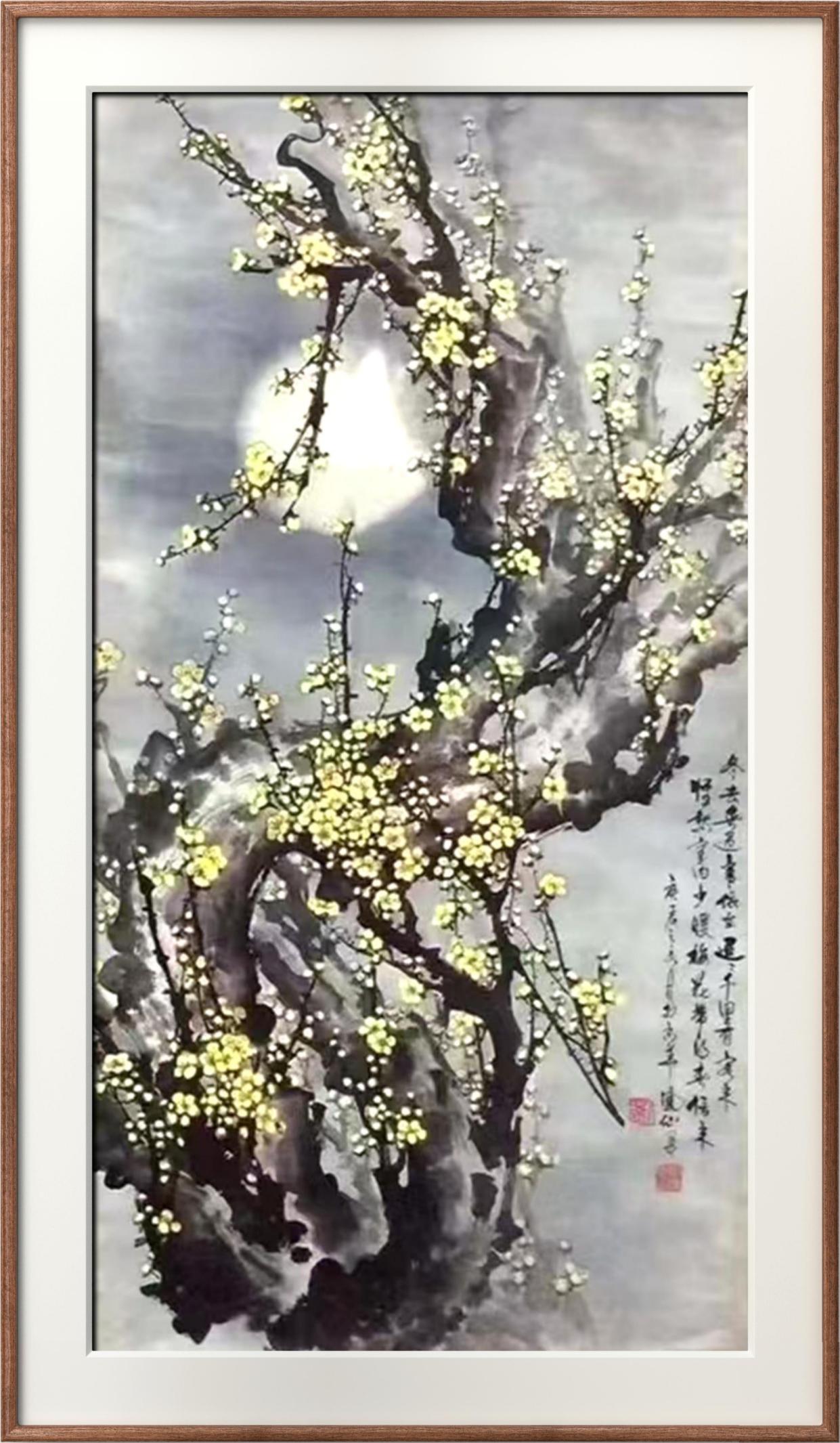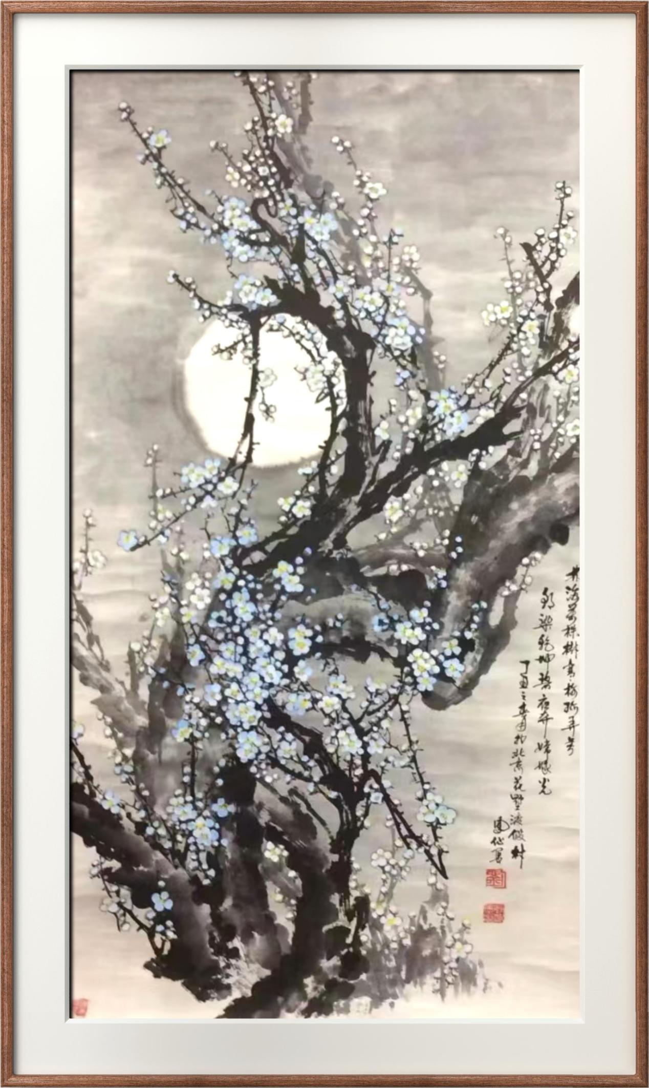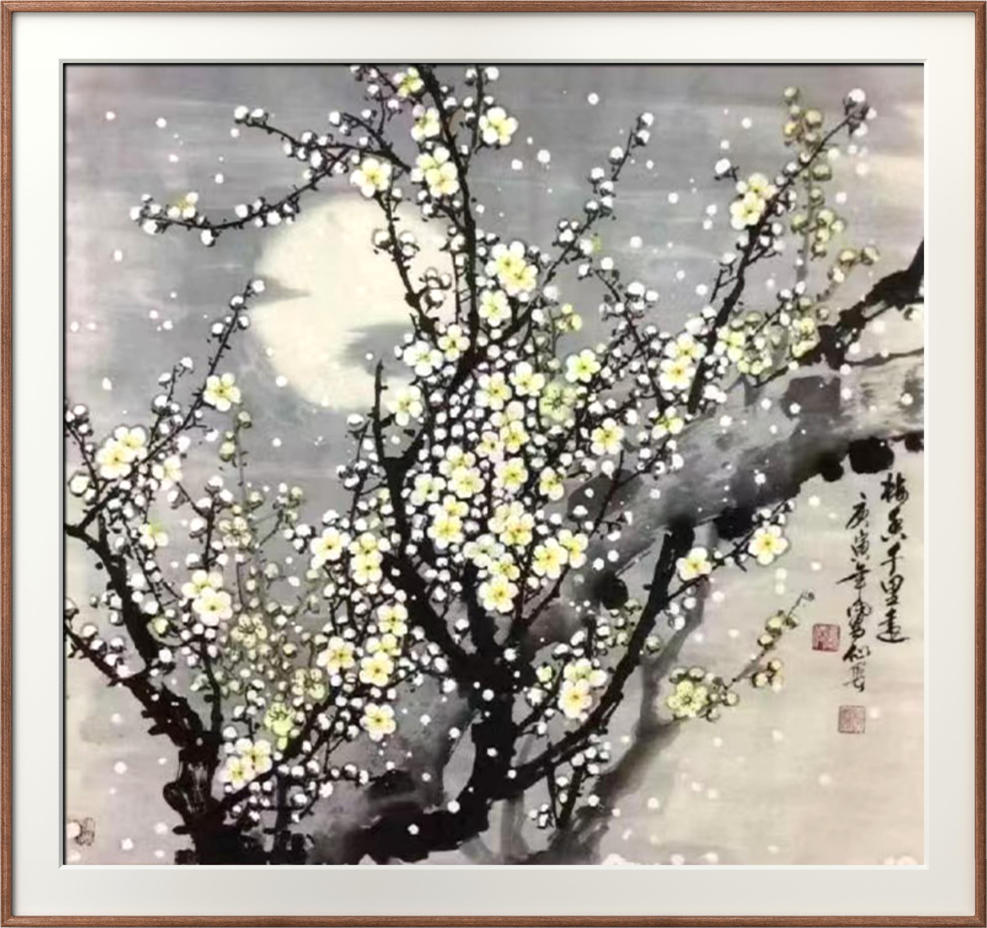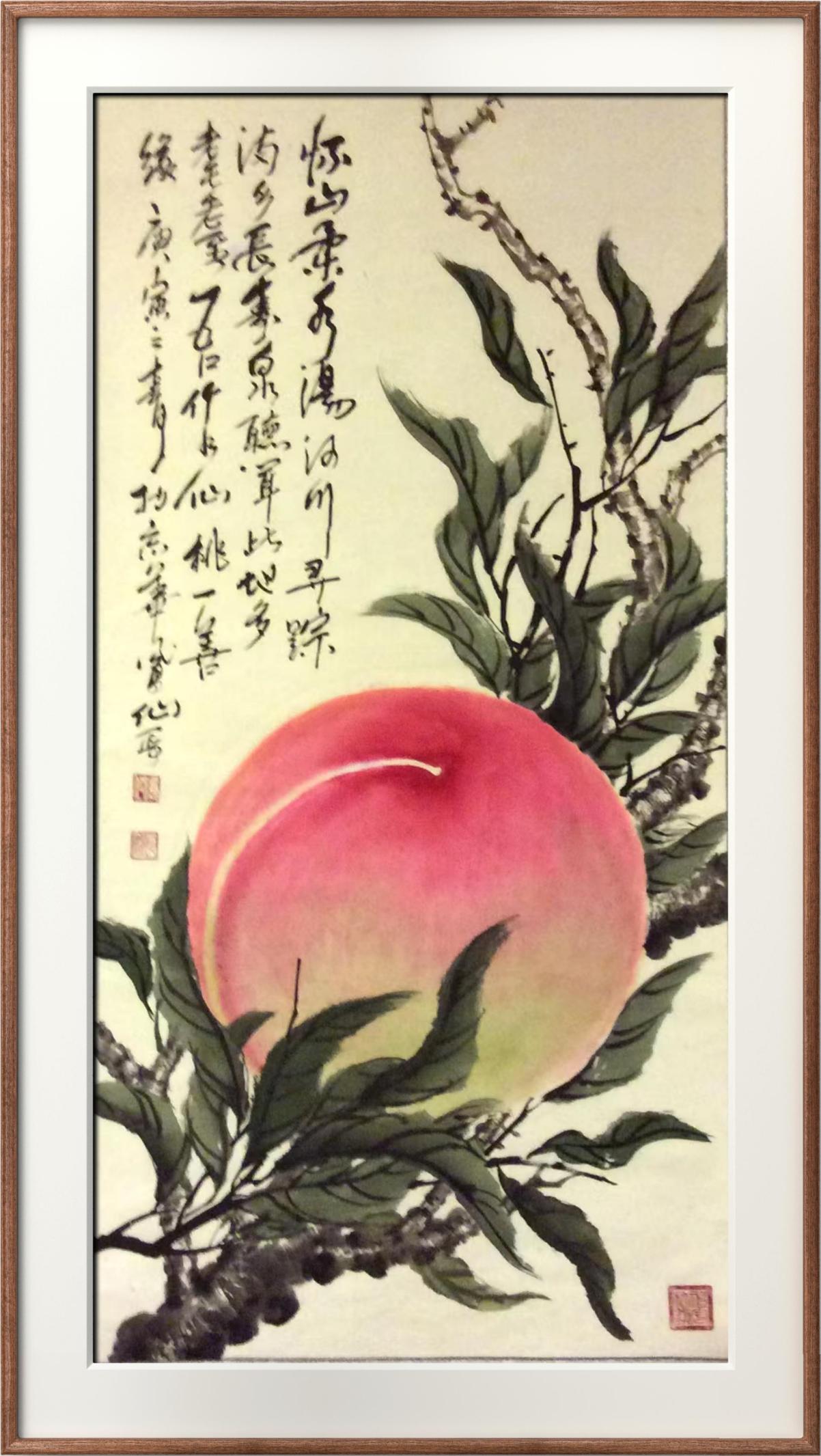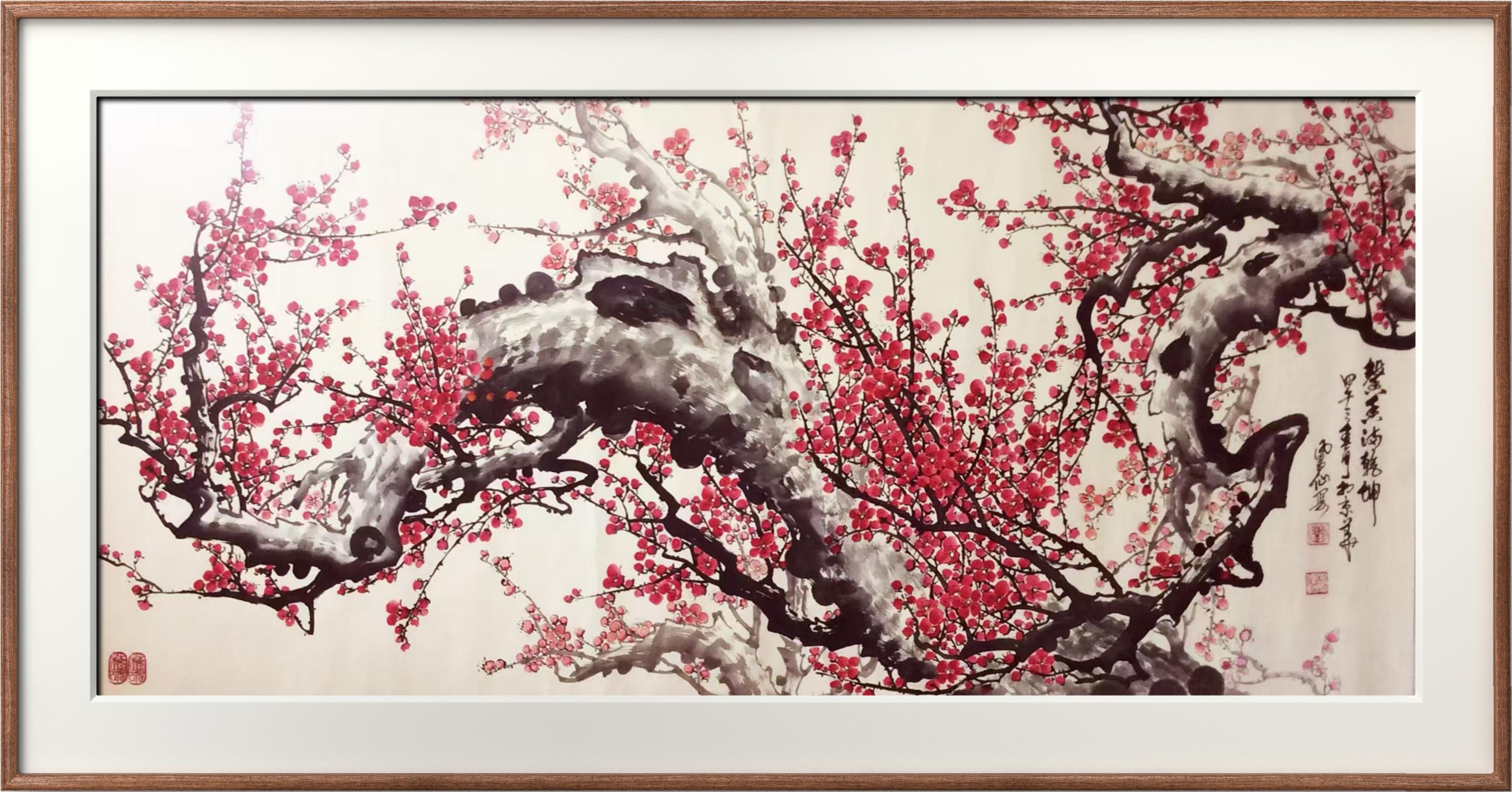 刘凤仙创作,意存笔先,画尽意在,豪放不显张扬,意境深远而不失恬淡清新,其梅花或艳如朝霞或白似瑞雪;寿桃或娇艳欲滴或灵秀芬芳,阵阵暗香仿佛跃出纸面,扑面而来,巧妙的将自然灵性点染画中,好似呼唤出了中国千年文化底蕴的深沉回声,诠释了中华民族古老艺术的深刻内涵。