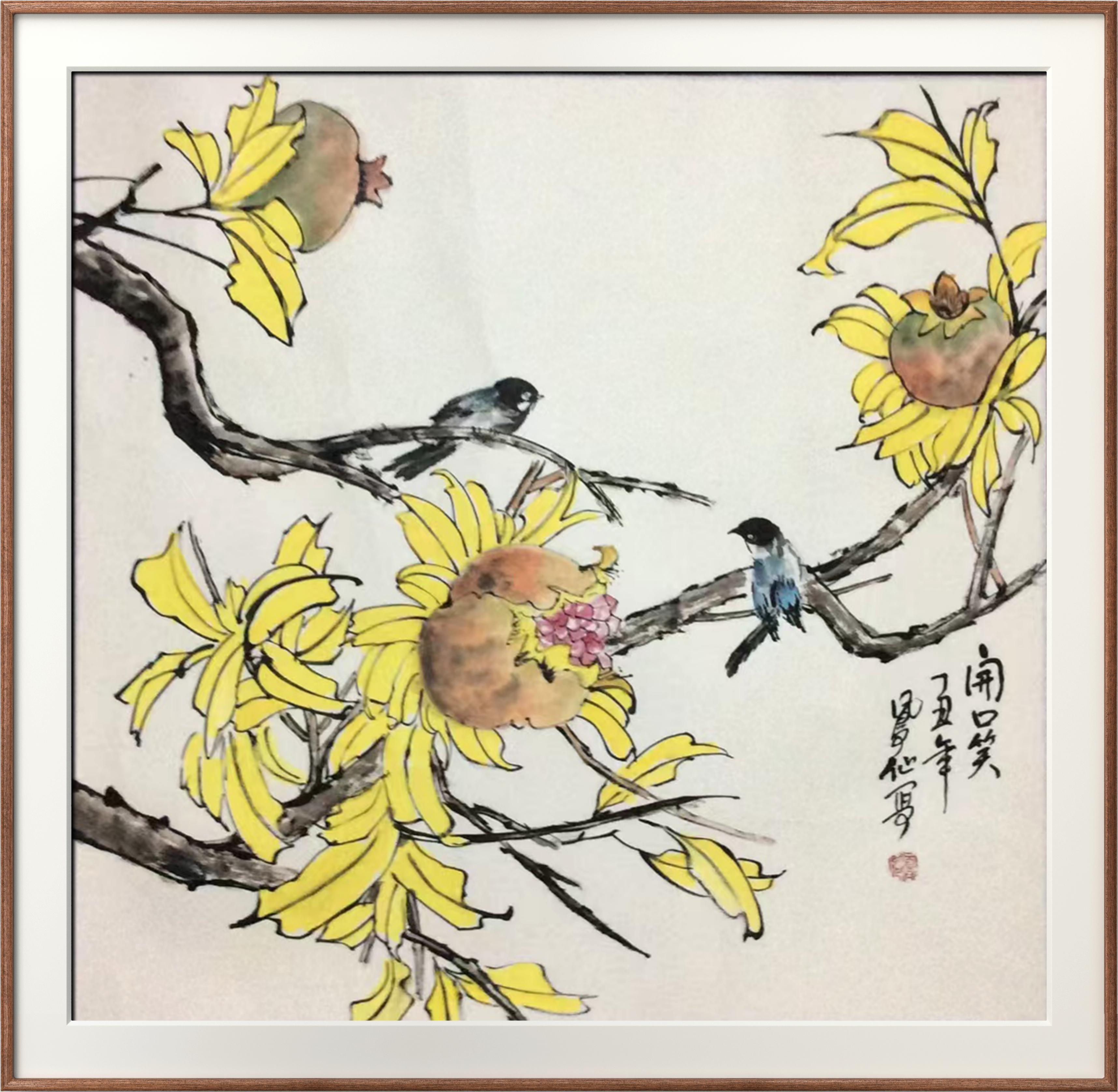 绘画作品中的诗文跋语往往代表作品主人的心声。一句好诗,能表现出作者的内涵和学养。一句好诗,亦能起到画龙点睛的作用。刘凤仙作品中的诗句布局巧妙,胸怀天地,在构图上,突出主体,讲求布局中的虚实对比与顾盼呼应,把发挥画意的诗歌题句,用与画风相协调的书法在适当的位置书写出来,辅以印章,成为一种以画为主的综合性书画艺术作品,留白空间的疏、密、聚、散;花、果、鸟、叶的柔嫩灵活,老干边缘的毛、涩质感,无不显示其作品的巧夺天工。