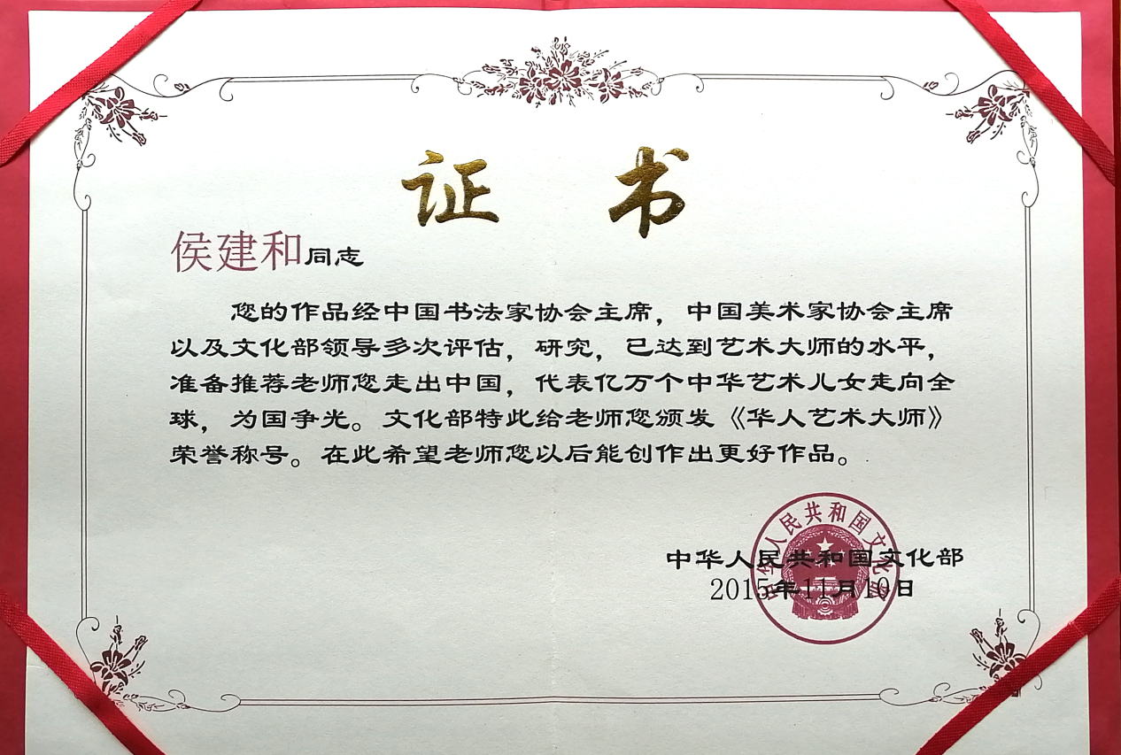 侯建和,笔名山人、1952年6月出生,江苏灌南人,中文专业毕业,在江苏淮安工作退休。自幼爱好书法艺术,2020年国务院颁发《人民艺术家》证书。兼任国家文旅部名誉顾问;外事工作委员会办公室“大国外交文艺使者”、“中国文化艺术国际代表”;国台海峡论坛文化顾问;中国乡土艺术协会顾问;中国国际教育电视台艺术顾问;中书协理事;中国国际文艺家协会常务理事;中国艺术研究院国家文化发展战略高级研究员;全球青少年书画艺术大会书画导师;巴黎艺术中心、央视书画频道、香港电视台签约、特聘艺术家等。多年来一直为传承和弘杨传统文化艺术鼓与呼,认为民族是艺术的土壤,民族的艺术也是世界的艺术,然而只有走向世界的民族艺术方能成为人类的艺术瑰宝。书法承二王书风,崇尚自然,长于楷、行、草、隶,认为学书应学古人之神韵,集山水之灵气,抒胸中之情怀,以达到形神韵的统一;艺术家的责任在于对美的创造和表现;在长期的创作实践中,师古不泥古,形成自己的风格,受到社会和艺术界的广泛关注。作品多次参加国内外展出,获奖并被收藏。1998年应邀参加“韩国98世界美术大展”,作品被韩国碑园林收藏;1999年作品入选《全国民间工艺美术书法大展》并获“创新奖”,中国文联授予“海峡两岸德艺双馨艺术家”称号;2001年中国文联艺术指导委员会授予“中国历代书画名家(当代名家)”称号;2008年作品入选“南疆杯”庆祝广西壮族自治区成立50周年中国著名书画家艺术精品提名展并获“特等奖”;2009年诗歌荣获“中国大众文学百花奖”;多次参加慈善捐赠活动,2014年中国少年儿童文化艺术基金会授予“慈善爱心人物”称号;2015国家文化部授予“中国当代书画艺术名家”称号,并颁发《华人艺术大师》证书;2015年美国集邮集团授予“中美杰出华人艺术家”证书;2018年纽约时代广场“中国艺术大家形象展播”工程,中法建交54周年“法国邮票上的中国艺术名家”活动;2019年作品参加纪念中法建交55周年“巴黎卢浮宫艺术展”,受聘法兰西皇家画院院士并获皇家荣誉勋章;2019年获人民日报“全国重点推荐艺术名家”在互联网宣传报道;2020年经中国文联同意由中国国际文艺家协会出资出版大红袍版《中国传统文化名家大典书画名人侯建和卷》。2020、2021年入编中央电视台牵头中国文联等多个部门参与编辑出版的《中国艺术榜样年鉴》、《庆祝建党100周年之时代文化传播使者》大型文献。2020年在人民日报组织的《扬我国魂佑我中华》暨献礼祖国七十一华诞艺术展大赛中获一等奖并获评“人民艺术家”,2020年国务院授予“人民艺术家”荣誉称号。2021年央媒联盟授予“全国十佳杰出功勋艺术家”称号;入选参加《人民日报》网络“艺承百年中国艺术代表人物”十二语种全球新闻报道活动;央视华夏之声《人民艺术家》文艺中国年度荣誉人物展播。参加新加坡联合早报、欧洲艺术协会、时代周刊等用艺术向世界讲好中国故事活动,荣获“中国根——海峡两岸艺术名家对话交流”活动书法组特等奖,全国台联授予“海峡两岸和平交流使者”称号。2022年入选央视重点推荐新时代艺术领袖网络宣传活动,并入编央视《新时代人民艺术家典藏》;中意文化和旅游年组委会授予“中意友好文化交流大使”;入编国际航空运输协会《中国之声》世航专刊;入编中国艺术白皮书《侯建和篇》;入编《中国艺术国际贸易指南》大典并荣获“国家重点推荐—走进世界艺术舞台的国艺巨匠”称号;中共二十大传统文化组委会、人民日报社、中美协、中书协等授予“艺术界时代楷模”证书。2023年国际文化艺术交流高峰论坛组委会颁发《中外文化交流杰出人物》证书;入编《复兴文库——人艺篇(侯建和卷)》;入编国家首部爱国主义教育学刊《中国红》;中央外事工作委员会办公室授予“大国外交文艺使者”、“中国文化艺术国际代表”。2024年国际奥委会授予“东方艺术大师”称号;入编学习贯彻二十大主题图书《党建——侯建和篇》;《中国艺术功勋集——侯建和卷》;《亘古中华——盛世图鉴》;《国际形势文化产业发展报告(蓝皮书)——侯建和卷》。2024年《人民日报》国庆75周年特刊发布“四个一批”人才工程重点推荐文化名家侯建和,中央宣传部颁发“文化名家暨四个一批人才”证书;国务院颁发《政府特殊津贴证书》;对外联络部颁发“外联杰出贡献专家”证书;爱国主义教育学刊编辑委员会授予“建国75周年盛世文化奠基人”;东盟文化信息委员会授予“东盟文化艺术交流大使”;中央外事工作委员会办公室授予“文化复兴、中国力量国际文化榜样”荣誉称号。2025年迎春杯全国优秀艺术作品评选组委会授予“最具收藏价值奖”等。