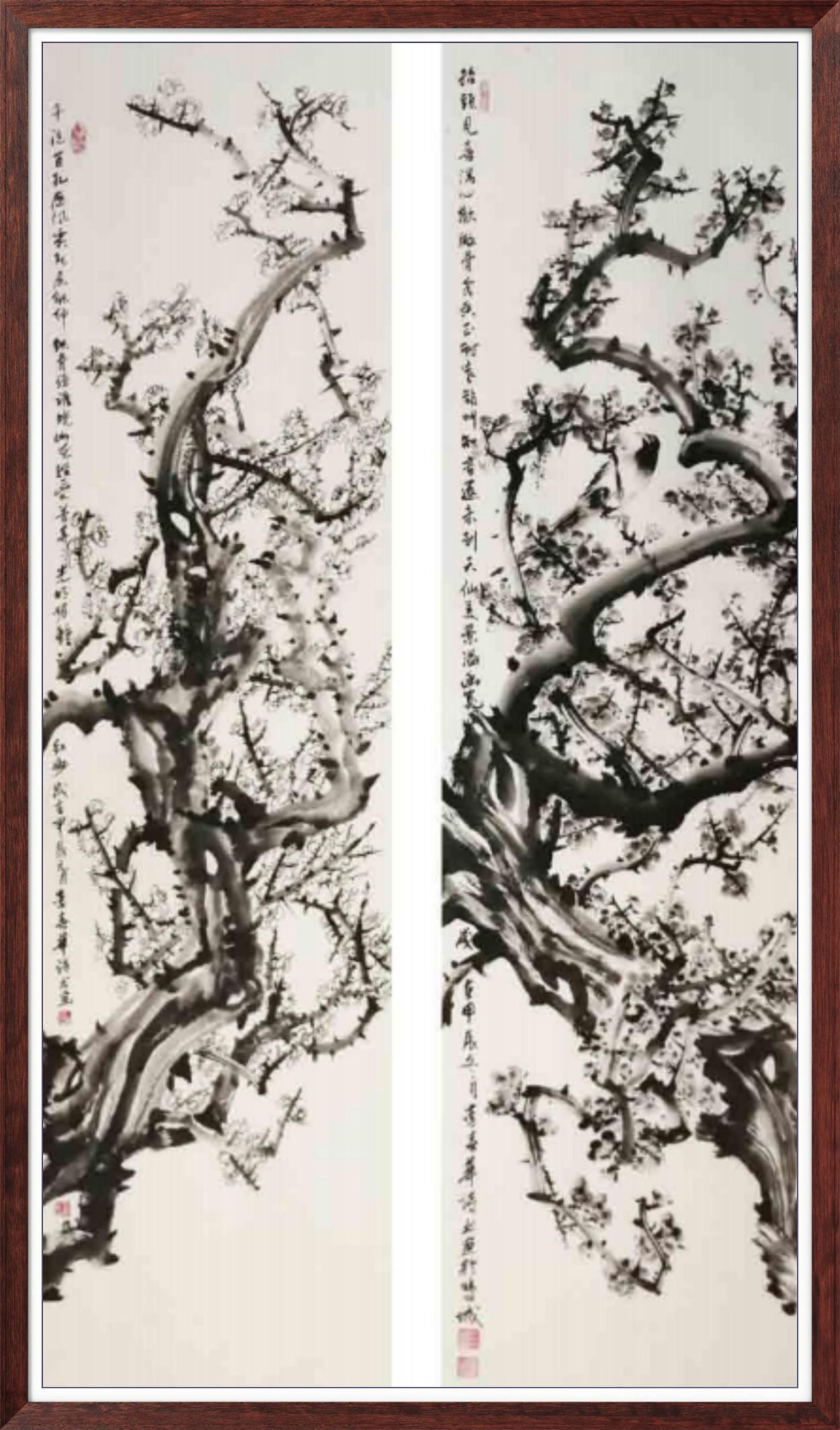 前无古人后没来者的梅花之神韵,从中体悟到艺术创新的多元性,终于在恪守古法、尊崇传统的主旨上,专就“骨法用笔”苦心探索,用纯熟的篆隶行草等书法融入画笔,彰显梅花的虬枝铁骨,刻画花萼之郁勃生机,笔墨更凝炼含蓄:篇幅虽不宏大,而气势充沛,气象庄穆清逸,体现了书画同源合一的民族艺术之独特美学理念,再者,也提升了梅花的审美意蕴,寄离了对顽强不屈的民族精神的赞美。且看题诗“春归笑隐绿丛中”之红梅,主干呈倒“人”字形兀立,中部与顶部枝岈纵横穿插,敷以或浓或淡之花朵,疏密相间:以流畅爽利之行草笔法勾勒主干,别具丽质丰神。细加品赏,但见整株主干都用淡墨,唯下部稍施浓墨苔点,备显浑穆苍古:而顶部亦有两三株浓墨细干,横斜伸延,与淡色主干相映,既觉活泼秀逸又生趣盎然。“傲骨生辉图”则另呈面目,以浓墨塑造屈曲盘错之下部老干,苍虬劲健之姿跃然纸上,书法之骨力昭然:唯左面一枝,用淡墨斜伸上空,与前者形成鲜明对比。既平衡了布局,亦增添了空灵秀逸之神韵。另三幅皆属狭长画幅,取上下走势,却造型各异:“绿梅图”似苍龙从空而降,活翻多姿,墨色又极富变化。整幅作品以淡雅清疏之绿梅,衬托极具动感之主干,动静相谐,相映成趣,而其余两幅均呈古朴疏朗之态,亦殊堪玩味。