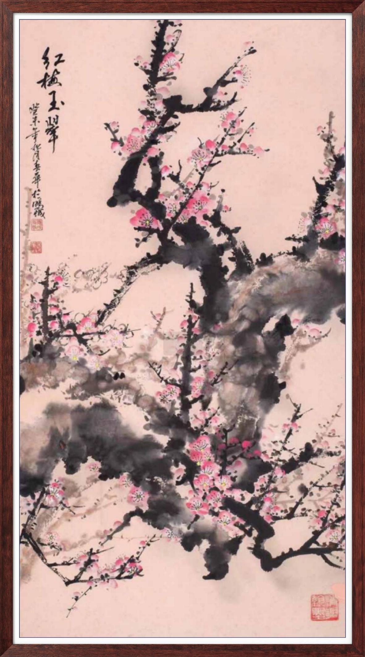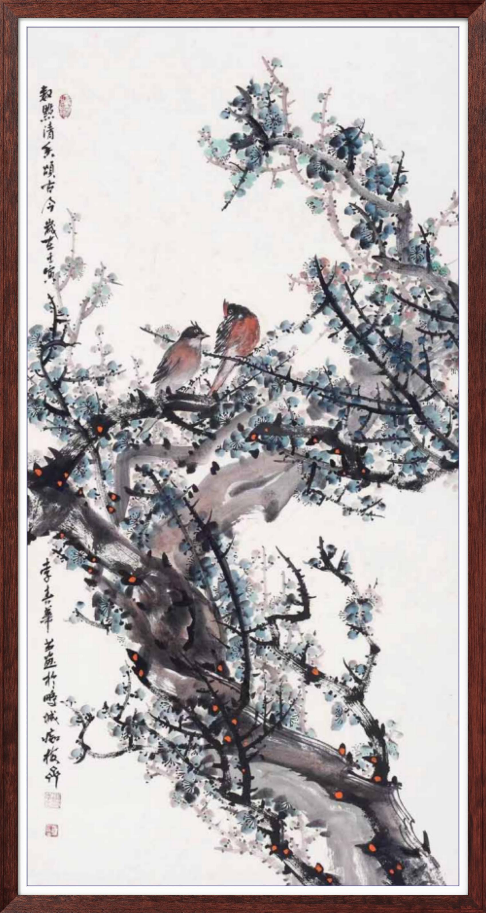 梅花,素具独特之意象;傲岸之干,耐寒之性,秾丽之花,清幽之香,位居“四君子”之首,成为传统花鸟11自元代王冕以后,梅花已于文士墨客高层次之审美领域卓立高标,名家辈出。就画幅的造型而言,有的善作单株疏梅,有的凭丛枝繁花以擅胜场。即使同为墨梅,金农以密枝纷披,杂以圈花取胜;吴昌硕则每以瘦挺之独株,配以长款之诗文相映成趣;至关山月,则又以“满幅繁花红欲燃”为特色;其后继者山东王进喜于斯道更有青胜于蓝之气概。面对画梅百家之各呈异采,各领风骚,李春华长期孜孜不倦于新技法之创新与新意境之开拓。