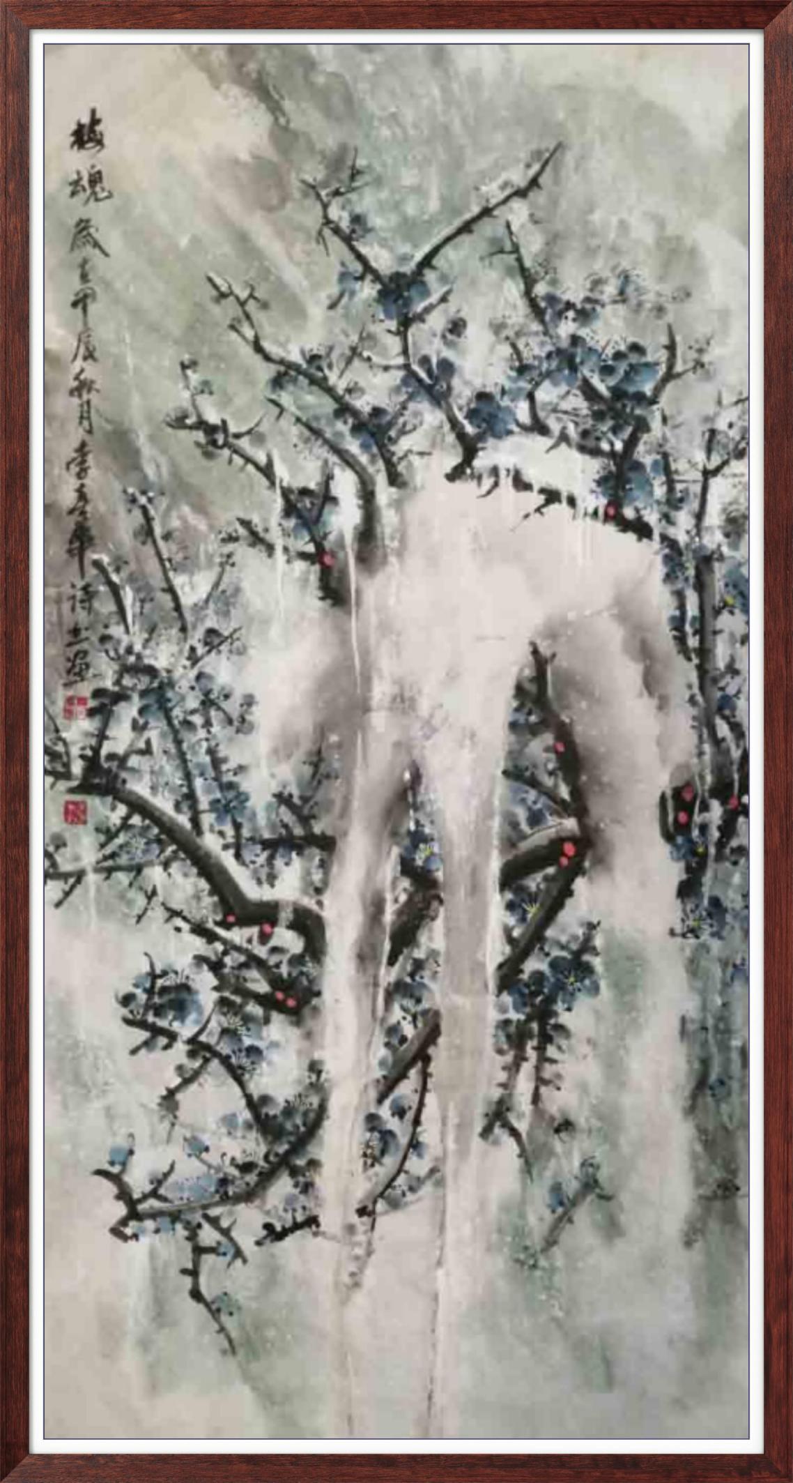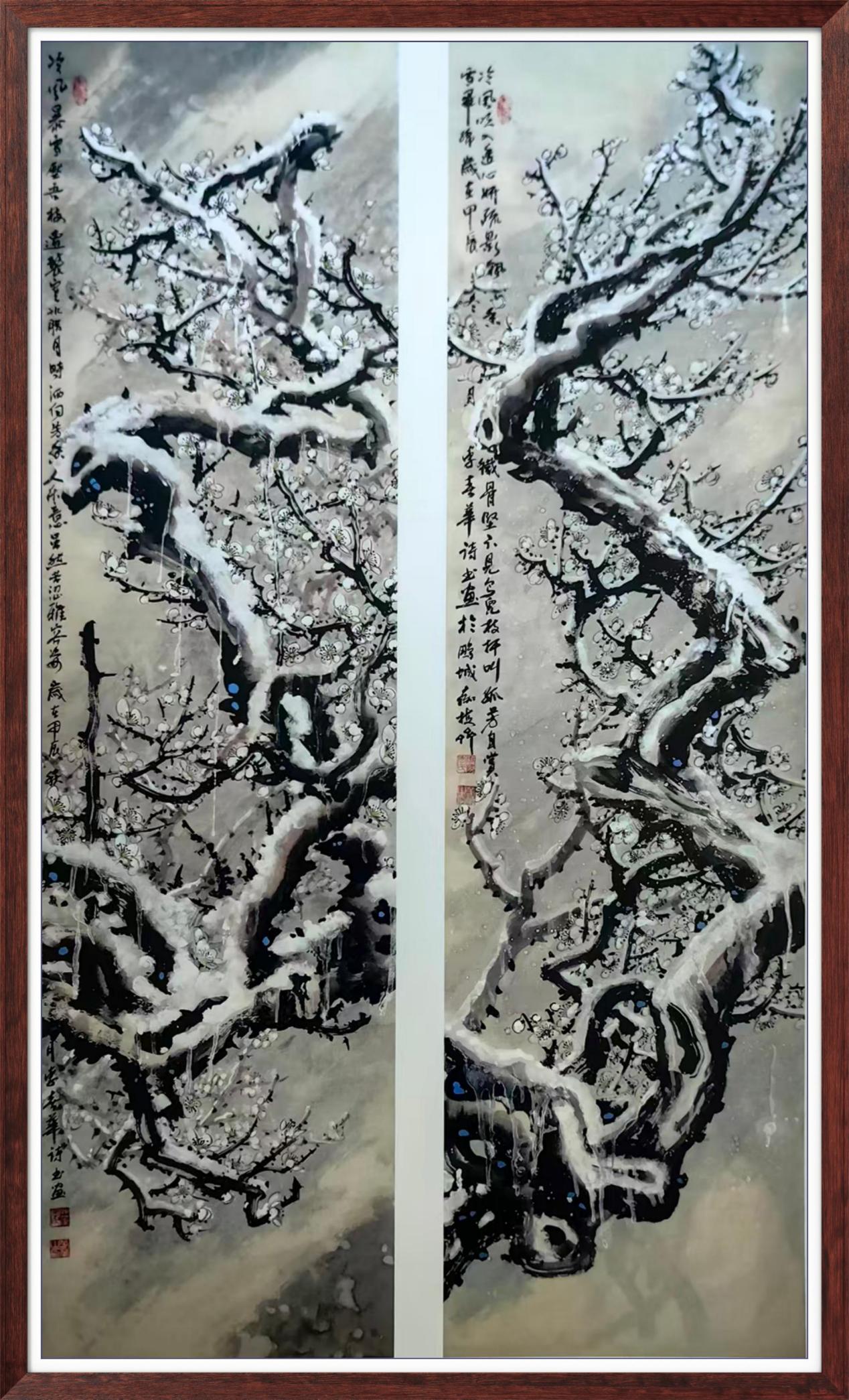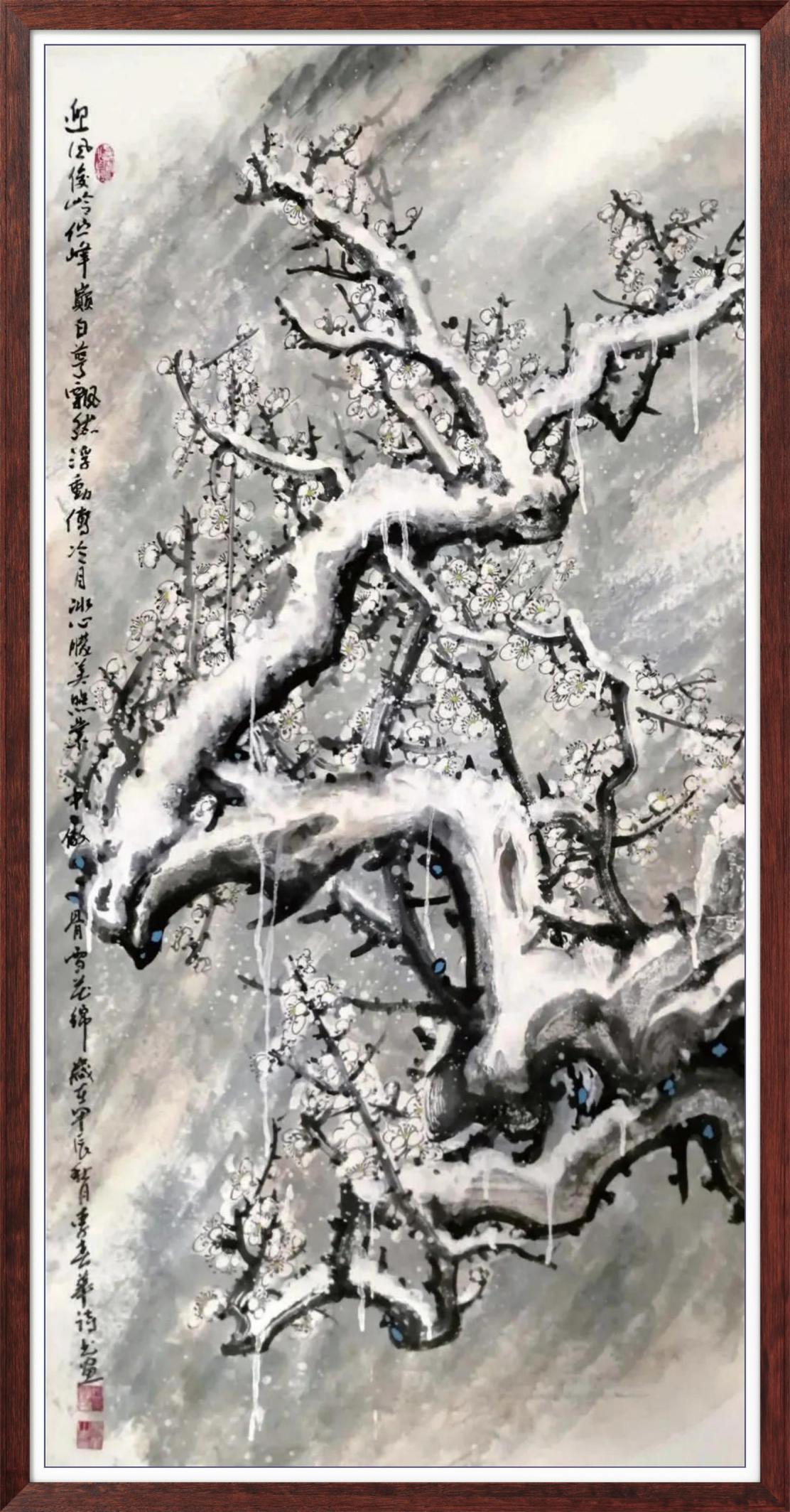 李春华老师长期孜孜不倦于新技法之创新与新意境之开拓,他深研当代名家风格,最擅用冰天雪地与浓霜寒湍之背景衬托梅花之繁荣,不唯尤显冷艳,更呈绚烂。他从梅花的气节中体悟到艺术创新的多元性,终于在恪守古法、尊崇传统的主旨上,专就“骨法用笔”苦心探索,用纯熟的篆隶行草等书法融入画笔,彰显梅花的虬枝铁骨,刻画花萼之郁勃生机,笔墨更凝炼含蓄:篇幅虽不宏大,而气势充沛,气象庄穆清逸,体现了书画同源合的民族艺术之独特美学理念。再者,也提升了梅花的审美意蕴,寄寓了对顽强不屈的民族精神的赞美。他的梅花佳作,有的花朵疏密相间:以流畅爽利之行草笔法勾勒主干,别具丽质丰神:有的枝干以浓墨塑造屈曲盘错之下部老干,苍虬劲健之姿跃然纸上,书法之骨力昭然;有的活翻多姿,墨色极富变化,动静相谐,相映成趣,呈现出古朴疏朗之态,亦殊堪玩味。