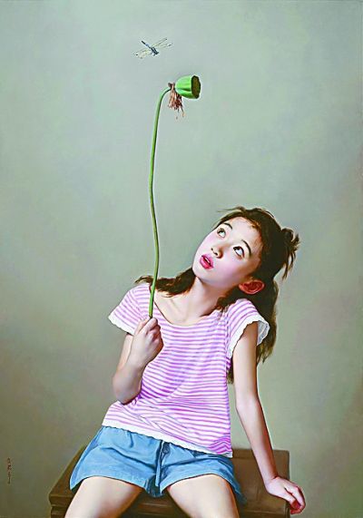 画家超然观察世界的目光,永远内含古典的秩序。这种秩序其实并非源于自然,而是画家心灵中的“绝对律令”。李贵君的《一切是否完好如初》里的那位姑娘,张开十指,想要尽力推开眼前那道完全透明,透明到好像并不存在的“墙”——这就是距离,它隔离了世界,只能这样隔空对视。李贵君以古典的唯美主义超然而优雅地进行表达,取得一种“间离”美学的效果。距离产生美,这美因此朦胧恍惚,使李贵君的人物画有了某种魔幻诗性,这或许也是一种艺术的超然。浪漫的玫瑰会永不凋谢吗?那只蜻蜓会落到少女的莲蓬上吗?没有答案,恰如他画中出现过的少女直视的双眸和女孩怀中黑猫警觉的黑瞳。