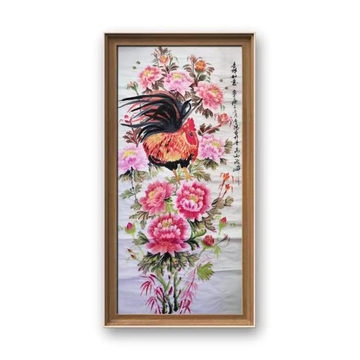 “平时不敢轻言语,一叫千门万户开”。鸡谐音“吉”,画鸡,寓意着吉祥如意,大吉大利。画鸡手法丰富,造型生动灵活。画中的公鸡眼炯炯有神,昂首阔步在牡丹花中。作品所表现主题的花冠组合有大小之分,颜色变化,有开放者,还有含苞欲放者,已求完美牡丹花富丽堂皇。整幅画寓意吉祥富贵。