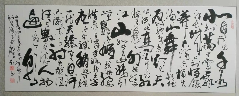 在几十年的艺术生涯中,靠着对艺术梦想的奋力追求和刚毅洒脱的性格不断创造艺术的闪光点,特别是在传统书法方面更是敬古凝心,刻苦钻研,弘扬传承。在大量临习古贴,研习古法,创新承现。在此基础上已另笔出炉楷书,一笔成划书写形式,用于书法教学。在重楷,草,善隶,行,篆的学习中,虚古求今,尽收实效。