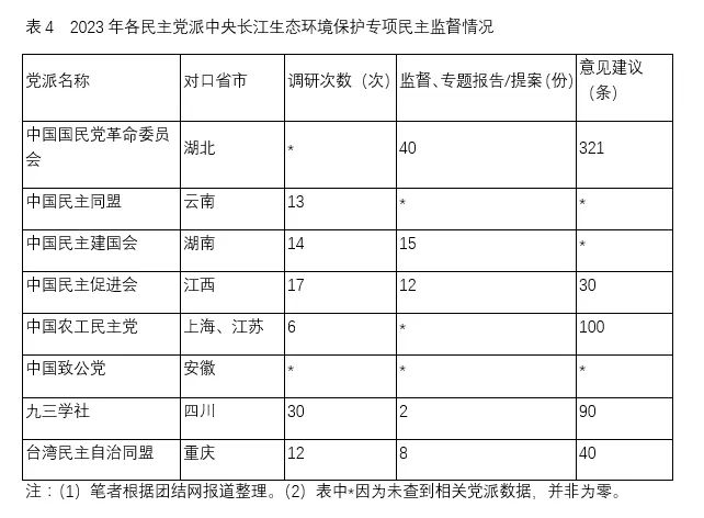 2016年在习近平总书记的推动下,中共中央委托各民主党派中央分别对8个承担脱贫攻坚重点任务的中西部省开展脱贫攻坚民主监督(见表3)。据统计,各民主党派在历时5年的监督工作中,走访农户20000户左右,开展各类调研450多次,形成监督报告、专题报告30多份,提出各层面意见建议2200多条。继脱贫攻坚民主监督之后,2021年6月,中央统战部和国家发展改革委、生态环境部共同牵头协调各民主党派中央、无党派人士围绕“长江生态环境保护”开展新一轮5年民主监督工作(见表4)。2023年,各民主党派中央、无党派人士开展实地调研160多次,各民主党派中央领导班子带队调研28次,形成“直通车”专报8份,提出各层面意见建议600多条。可以看到,民主党派的民主监督是办事、成事的监督,这完全不同于西方国家竞争性多党制下的对抗式监督。在中国新型政党制度下,民主党派和无党派人士既能够充分发挥其民主监督积极性,也能够助力中国共产党提高治国理政能力。