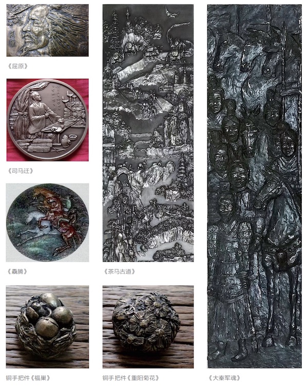 随后,程方平陆续设计制作了多个专题作品,包括:《屈原》《竹林七贤》《司马迁》(与袁飞合作)、《草圣怀素》(与袁飞合作)、《江南田园》《茶马古道》(由大铜章收藏者协会创始人叶峰支持)、《驫(biao)腾》、《大秦军魂》、《一蓑烟雨任平生(苏东坡)》等。此外,他还设计制作了一批情趣盎然的铜铸手把件,这些作品充满了中国的传统艺术和文人气息。在设计与制作过程中,程方平多方借鉴了中外雕塑的历史经验,进行了个性化的设计尝试。特别是在书法、篆刻、国画、外文等元素的融入方面,取得了较为理想的表现效果。