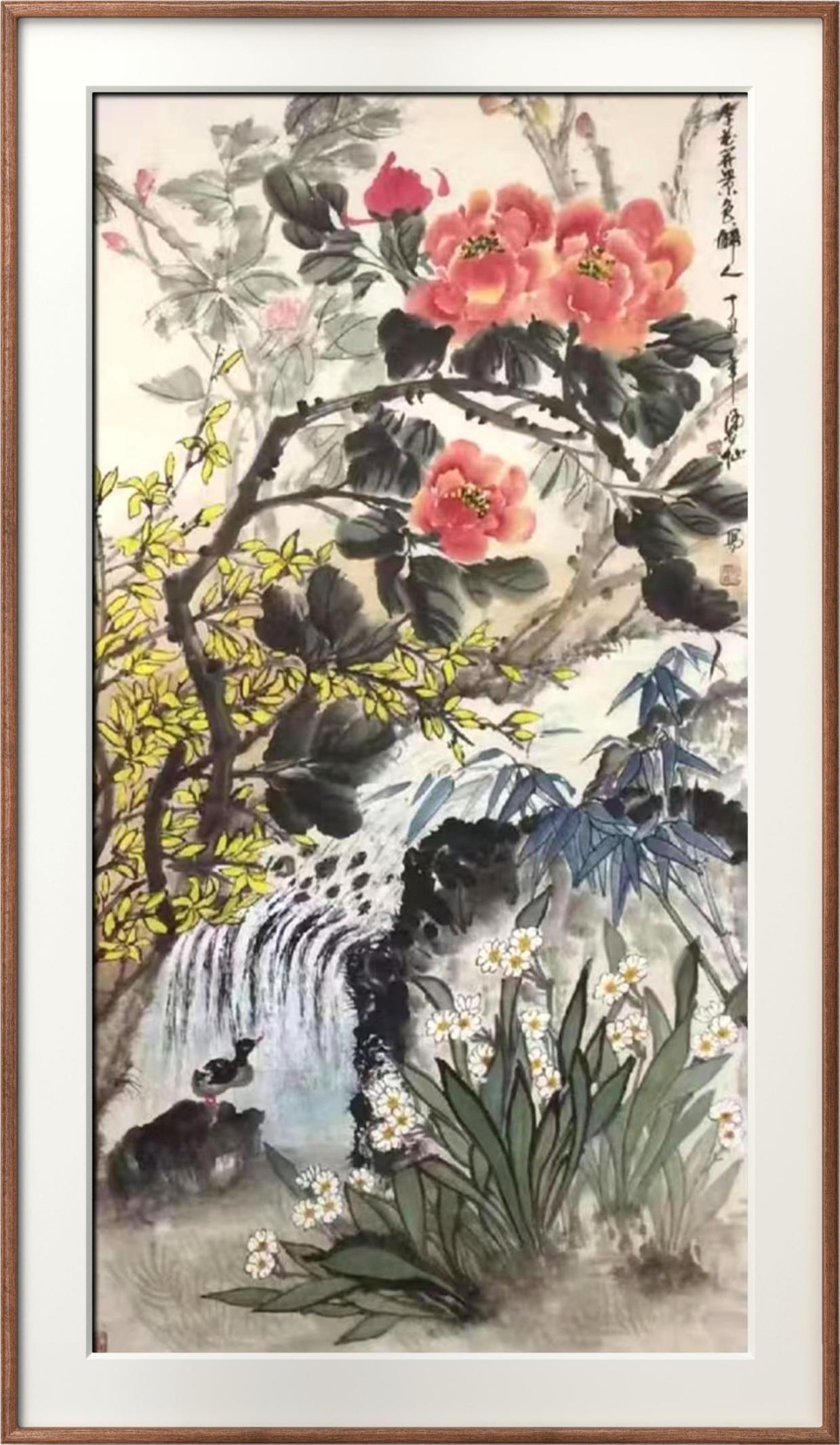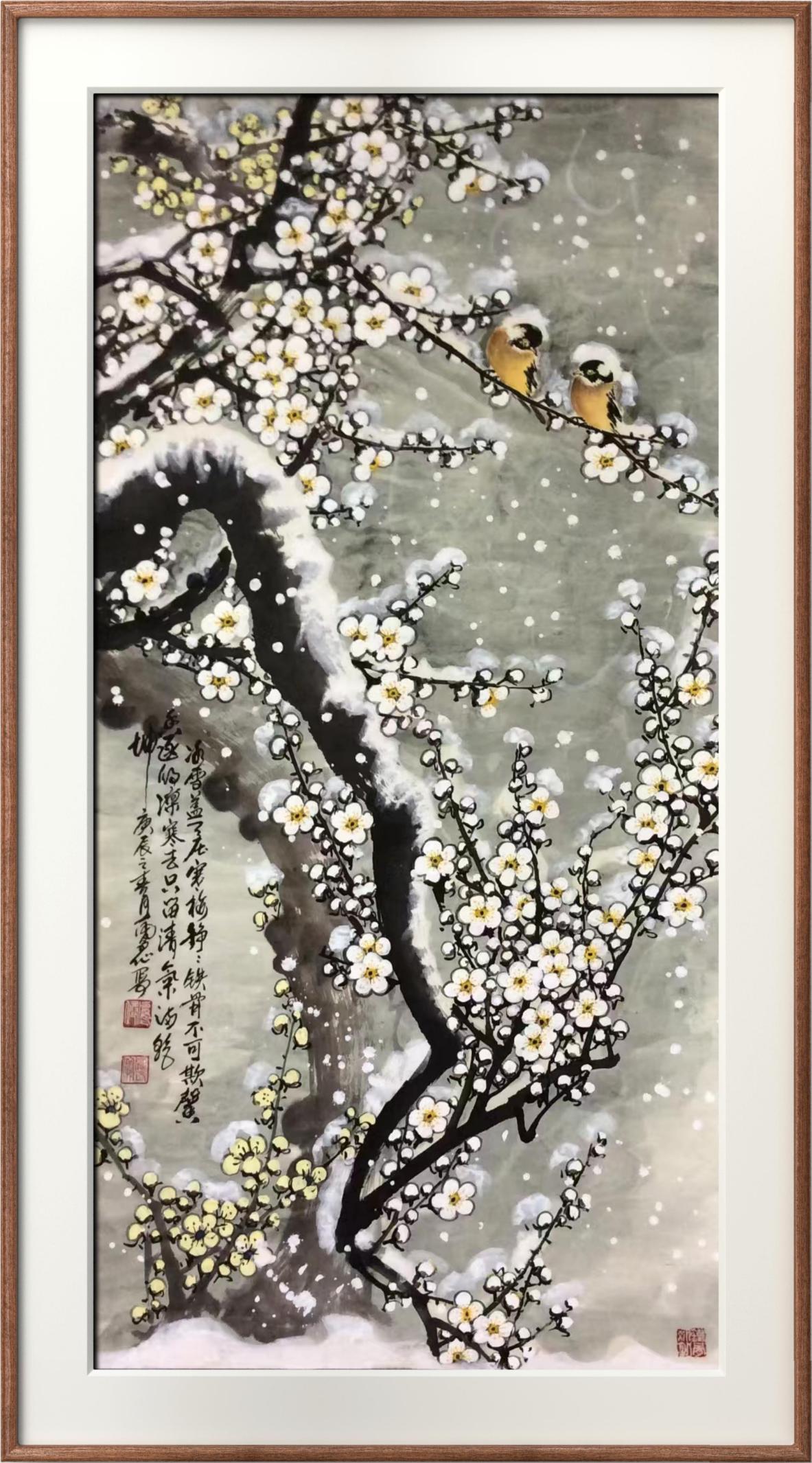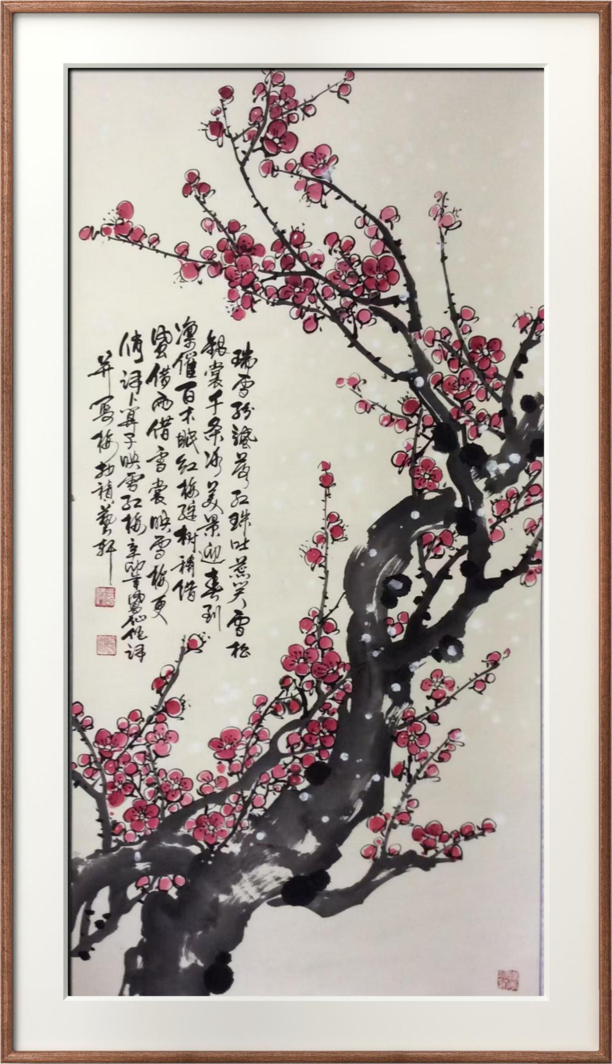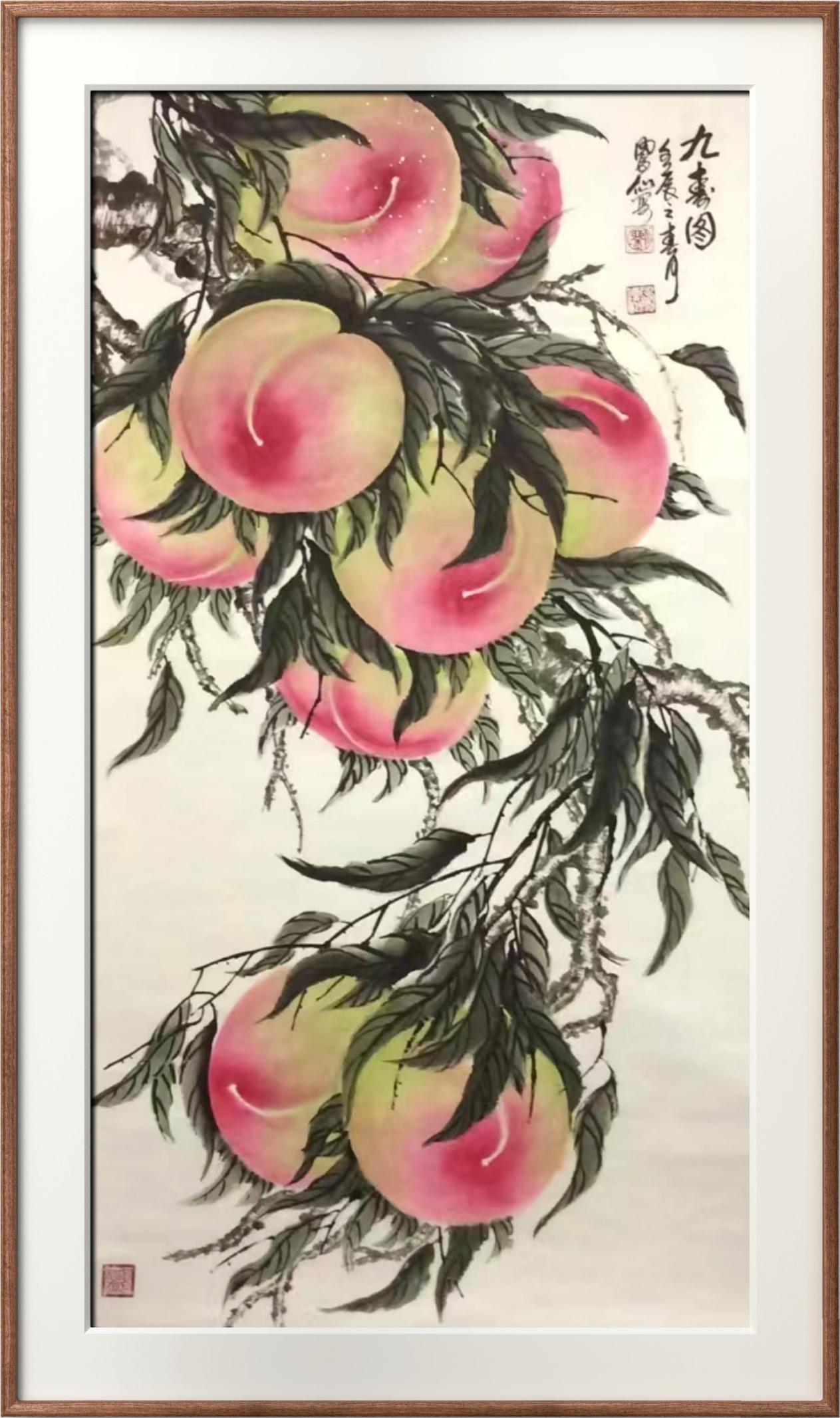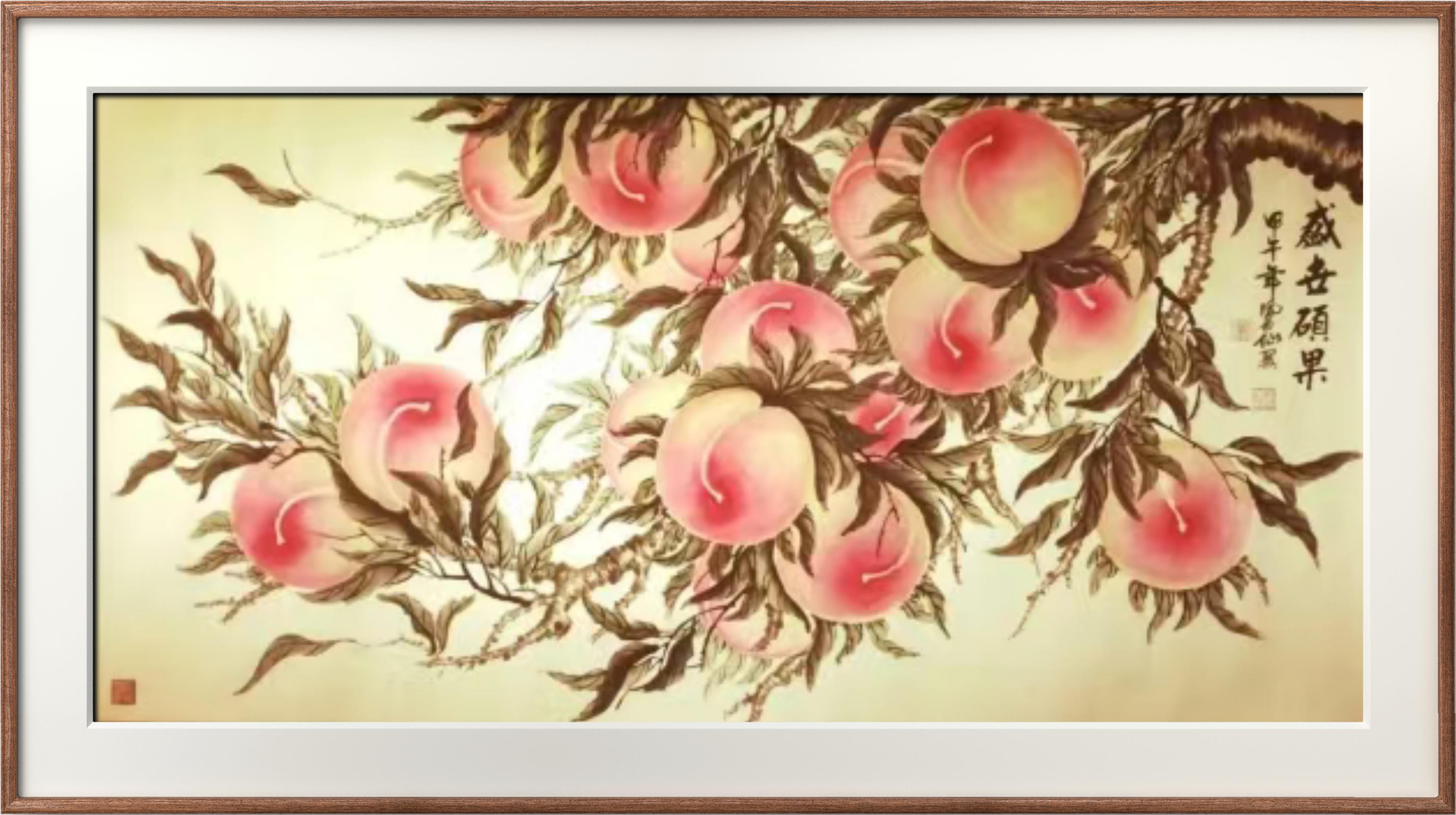 刘凤仙创作,意存笔先,画尽意在,豪放不显张扬,意境深远而不失恬淡清新,其梅花或艳如朝霞或白似瑞雪;寿桃或娇艳欲滴或灵秀芬芳,阵阵暗香仿佛跃出纸面,扑面而来,巧妙的将自然灵性点染画中,好似呼唤出了中国千年文化底蕴的深沉回声,诠释了中华民族古老艺术的深刻内涵。