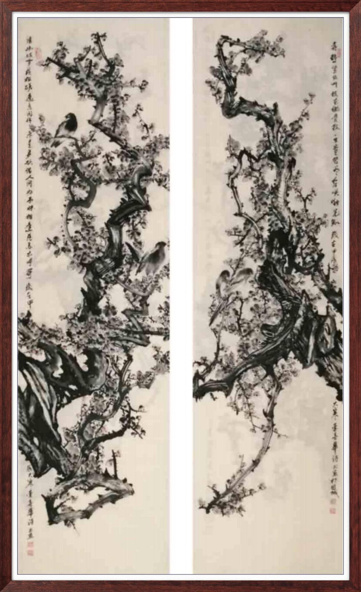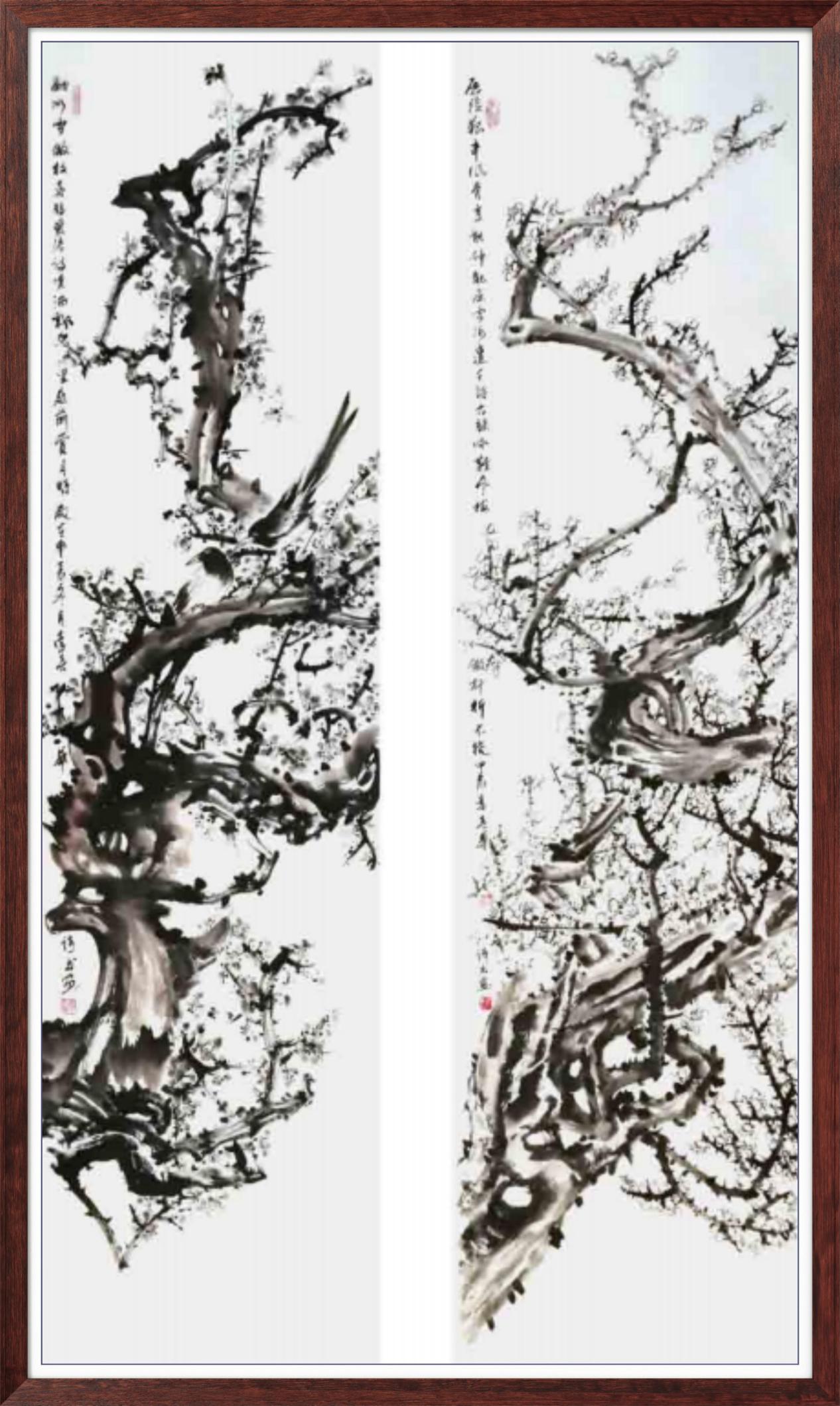 前无古人后没来者的梅花之神韵,从中体悟到艺术创新的多元性,终于在恪守古法、尊崇传统的主旨上,专就“骨法用笔”苦心探索,用纯熟的篆隶行草等书法融入画笔,彰显梅花的虬枝铁骨,刻画花萼之郁勃生机,笔墨更凝炼含蓄:篇幅虽不宏大,而气势充沛,气象庄穆清逸,体现了书画同源合一的民族艺术之独特美学理念,再者,也提升了梅花的审美意蕴,寄离了对顽强不屈的民族精神的赞美。且看题诗“春归笑隐绿丛中”之红梅,主干呈倒“人”字形兀立,中部与顶部枝岈纵横穿插,敷以或浓或淡之花朵,疏密相间:以流畅爽利之行草笔法勾勒主干,别具丽质丰神。细加品赏,但见整株主干都用淡墨,唯下部稍施浓墨苔点,备显浑穆苍古:而顶部亦有两三株浓墨细干,横斜伸延,与淡色主干相映,既觉活泼秀逸又生趣盎然。“傲骨生辉图”则另呈面目,以浓墨塑造屈曲盘错之下部老干,苍虬劲健之姿跃然纸上,书法之骨力昭然:唯左面一枝,用淡墨斜伸上空,与前者形成鲜明对比。既平衡了布局,亦增添了空灵秀逸之神韵。另三幅皆属狭长画幅,取上下走势,却造型各异:“绿梅图”似苍龙从空而降,活翻多姿,墨色又极富变化。整幅作品以淡雅清疏之绿梅,衬托极具动感之主干,动静相谐,相映成趣,而其余两幅均呈古朴疏朗之态,亦殊堪玩味。