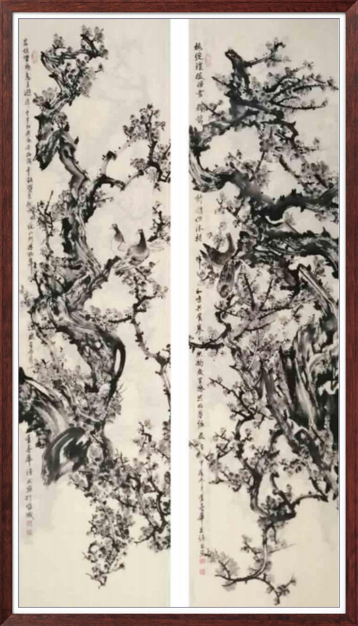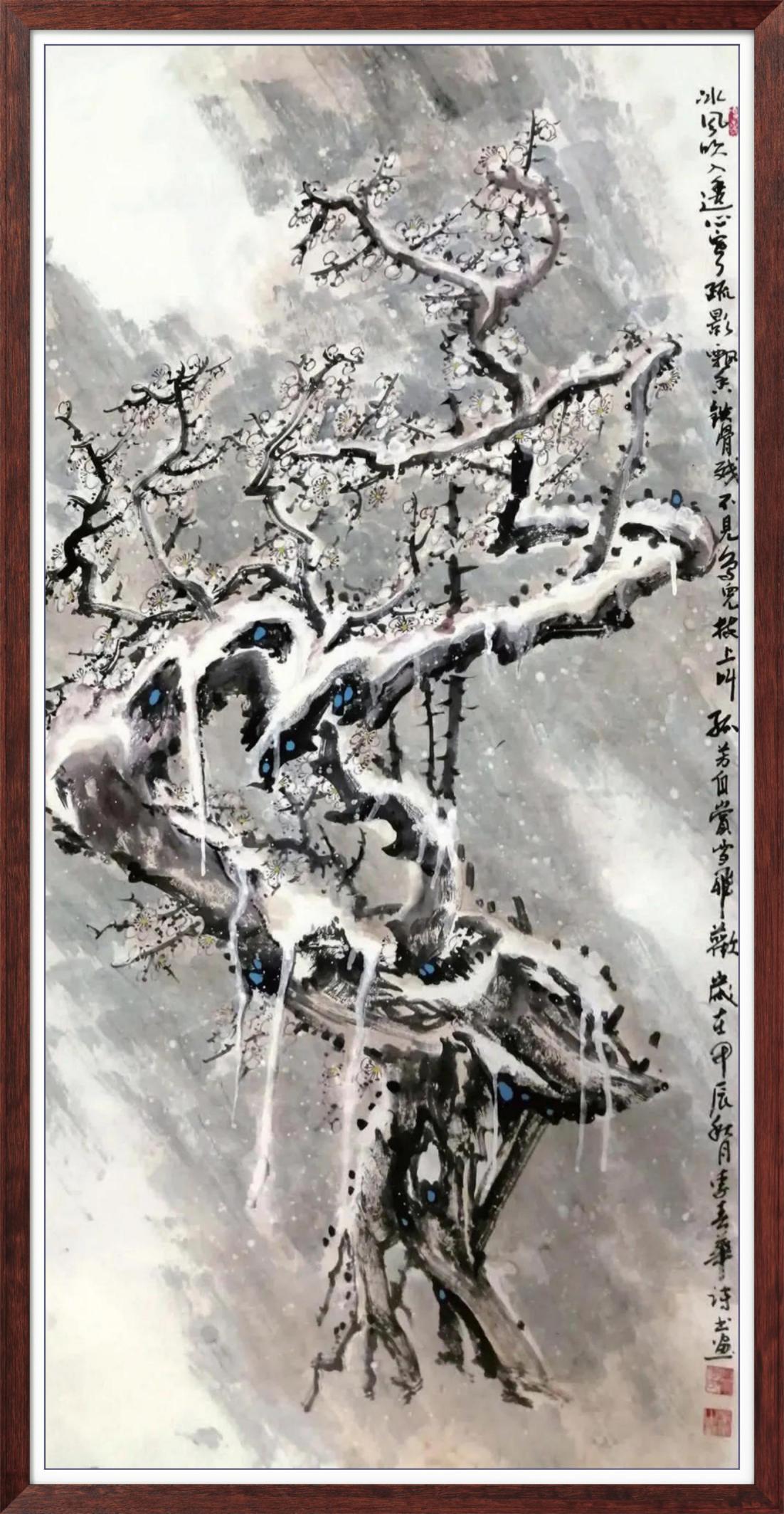 李春华老师长期孜孜不倦于新技法之创新与新意境之开拓,他深研当代名家风格,最擅用冰天雪地与浓霜寒湍之背景衬托梅花之繁荣,不唯尤显冷艳,更呈绚烂。他从梅花的气节中体悟到艺术创新的多元性,终于在恪守古法、尊崇传统的主旨上,专就“骨法用笔”苦心探索,用纯熟的篆隶行草等书法融入画笔,彰显梅花的虬枝铁骨,刻画花萼之郁勃生机,笔墨更凝炼含蓄:篇幅虽不宏大,而气势充沛,气象庄穆清逸,体现了书画同源合的民族艺术之独特美学理念。再者,也提升了梅花的审美意蕴,寄寓了对顽强不屈的民族精神的赞美。他的梅花佳作,有的花朵疏密相间:以流畅爽利之行草笔法勾勒主干,别具丽质丰神:有的枝干以浓墨塑造屈曲盘错之下部老干,苍虬劲健之姿跃然纸上,书法之骨力昭然;有的活翻多姿,墨色极富变化,动静相谐,相映成趣,呈现出古朴疏朗之态,亦殊堪玩味。