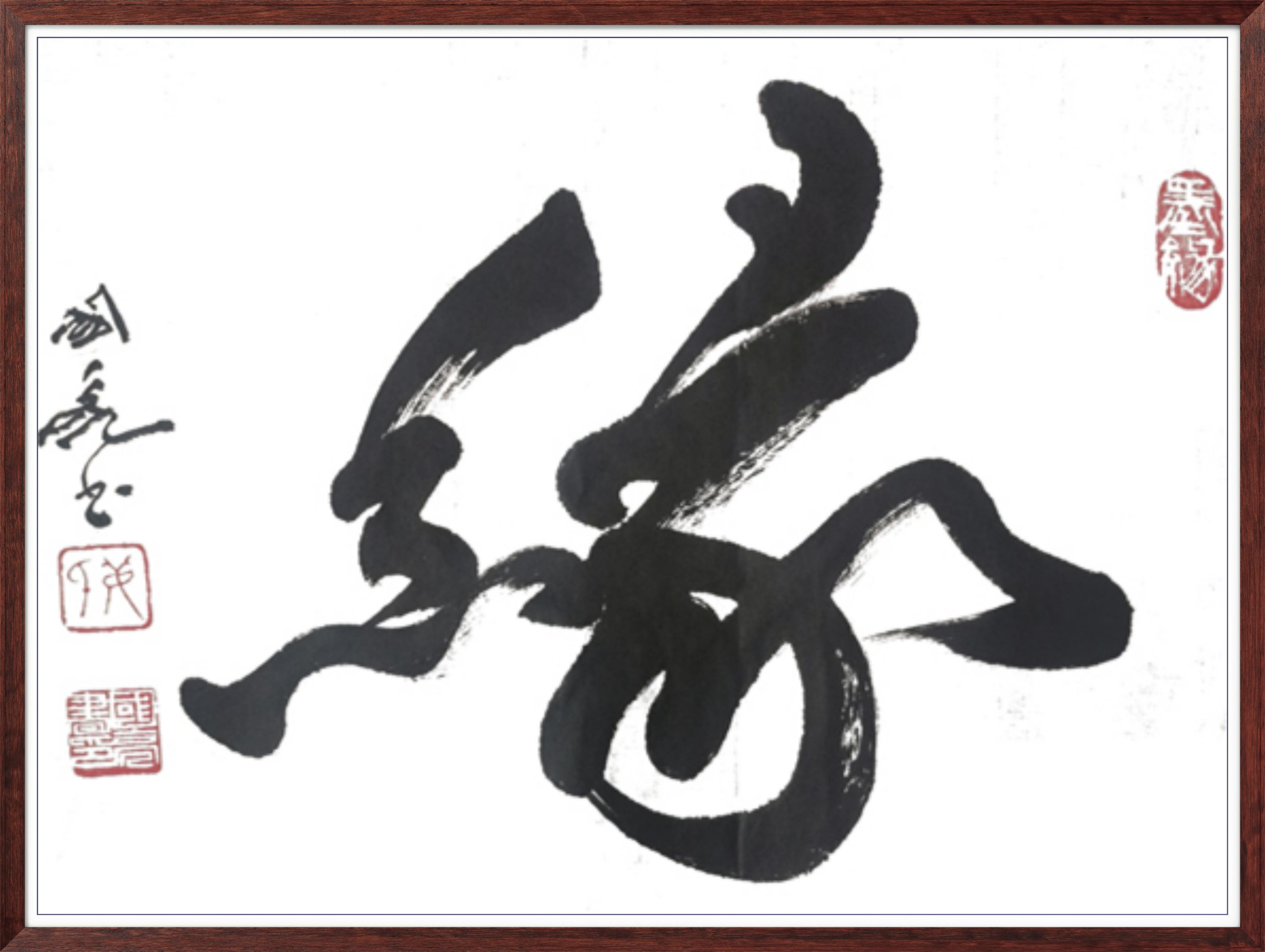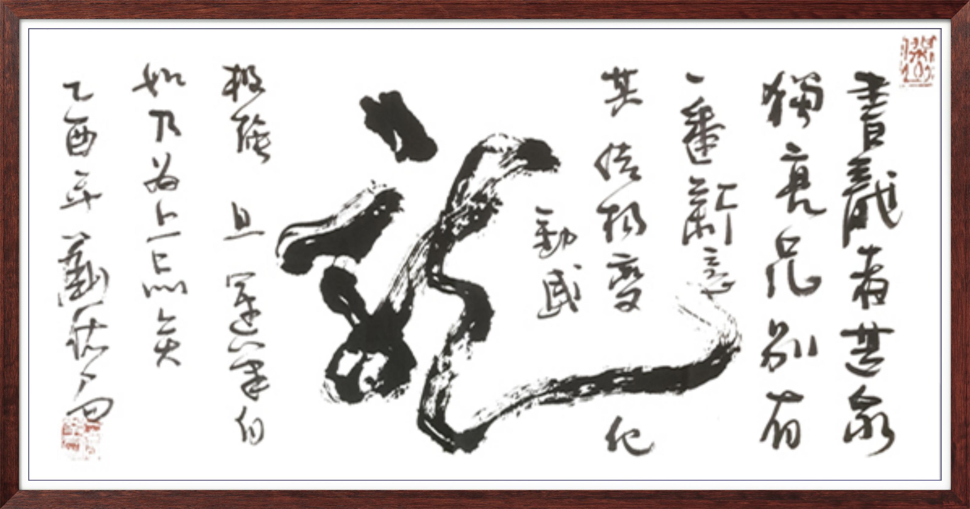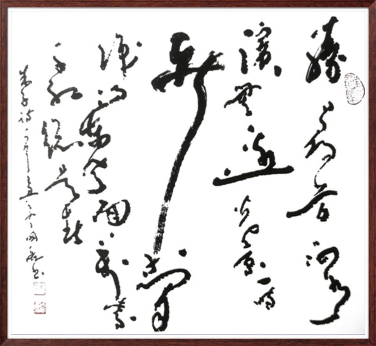 先生之书法,以 “雄强奔放、苍劲洒脱” 立格,独树一帜于书坛。他深耕传统而不泥古,遍临诸家碑帖,深谙汉隶之古朴、唐楷之严谨、行草之灵动,而后破茧成蝶,创新性融合传统技法与现代审美,形成独有的艺术语言。其字迹豪放有力,每一笔皆饱含决心与激情;线条清晰自由,似山水奔涌、松涛激荡,于笔墨流转间传递出磅礴的生命张力。观其作,既能品味《兰亭》之雅韵、《祭侄文稿》之沉郁,亦能感受到当代审美之鲜活,真正实现了 “传统为根、时代为魂” 的艺术表达。更难得者,先生之书法兼具思想深度与情感温度,作品中既有家国情怀的雄浑抒发,亦有人生哲思的清雅流露,使人在视觉震撼之余,更能体悟艺术家内心的澄澈与丰盈。