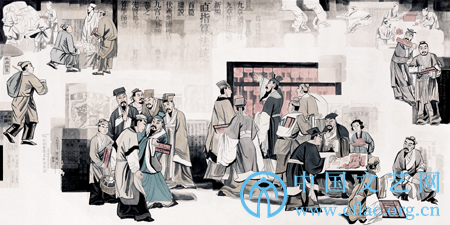 创作历史题材的美术作品绝非易事,艺术家既要突出中心主题,又要在尊重客观史实的基础上进行适当艺术虚构。那么,如何以版画的形式讲好这个历史故事?“为了获得创作灵感,我们曾两次拜谒程大位故居,寻访先人踪迹,参观黄山市以程大位名字命名的珠算特色学校——大位小学,并与师生们交流。另外,我们还前往南通中国珠算博物馆,通过一系列采风活动,搜集、整理了大量历代与算盘相关的文献和图像资料。这些丰富的史实和珠算文化、生动的现实场景,极大地拓展了创作思路。 ”班苓介绍:“最后,我们理清了珠算历史发展的脉络,认为画面内容要以历史人物的活动为主体,来表现历史人物和算盘之间的关系。 ”