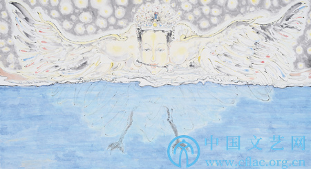 在我看来, 《山海经》中的人神兽3种形态应该是一种共同并存为一体的综合形态,它们纠结或纠缠、合协或合作,是一个人神兽及万物皆灵的世界。我在作品里更多的是要表达它们相互纠缠不清的诗情,有些是人神相爱,有些是人神兽性的相处、沟通,因而,所画的形象有些飘逸温婉,我把我感到的美好也置入我所理解的《山海经》中了。