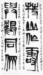 在时间上白石老人是距我们最近的一代艺术大师。他出身于农家,做过木匠,其诗、书、画、印兼及其人品,堪称五绝。每每见到他的作品,总有一种想流泪的感觉。一个普通中国老百姓,把毕生的精力、情感都投入到艺术创造中,奉献给他的祖国、人民以巨大的精神财富,实在让人敬佩不已,真正无愧于"人民艺术家"的称号。伟哉!白石老人。 白石老人的书法得力于李北海、《三公山》及《天发神谶碑》,作品气息浑厚苍劲、生辣朴茂。他的篆书对联写得气势雄伟,波澜壮阔,用笔纵横涂抹,不与点画细微处斤斤计较,反而最佳的效果却表露出来,既有秦汉人的雄强朴厚,又有现代人以古为今的生气;行草书显然得力于李北海,但不取其流美处,专从生辣处下力,写得满不在乎,完全一派自己的面目。 |