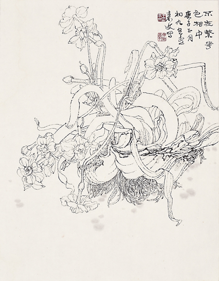 从中国传统花鸟画的发展进程来讲,王来文也占据着独特而重要的一席,尤其是在福建地域深厚的传统文人画基础上坚守着承传。我们可以看到,凡是从福建地域走出来的花鸟画家均携带着一种以水仙花和荷塘月色为象征的独特味道,充分显现着来自于闽地风物和人文关怀的艺术特征。因此,王来文古法用笔和白描技法的完美结合,不仅体现了他特有的风骨与品格,而且在当代过度强调“色墨融合”的审美潮流之下,王来文的白描花鸟画可以说是独树一帜、独领风骚,让当代美术界看到了一种纯粹的笔墨精神。
